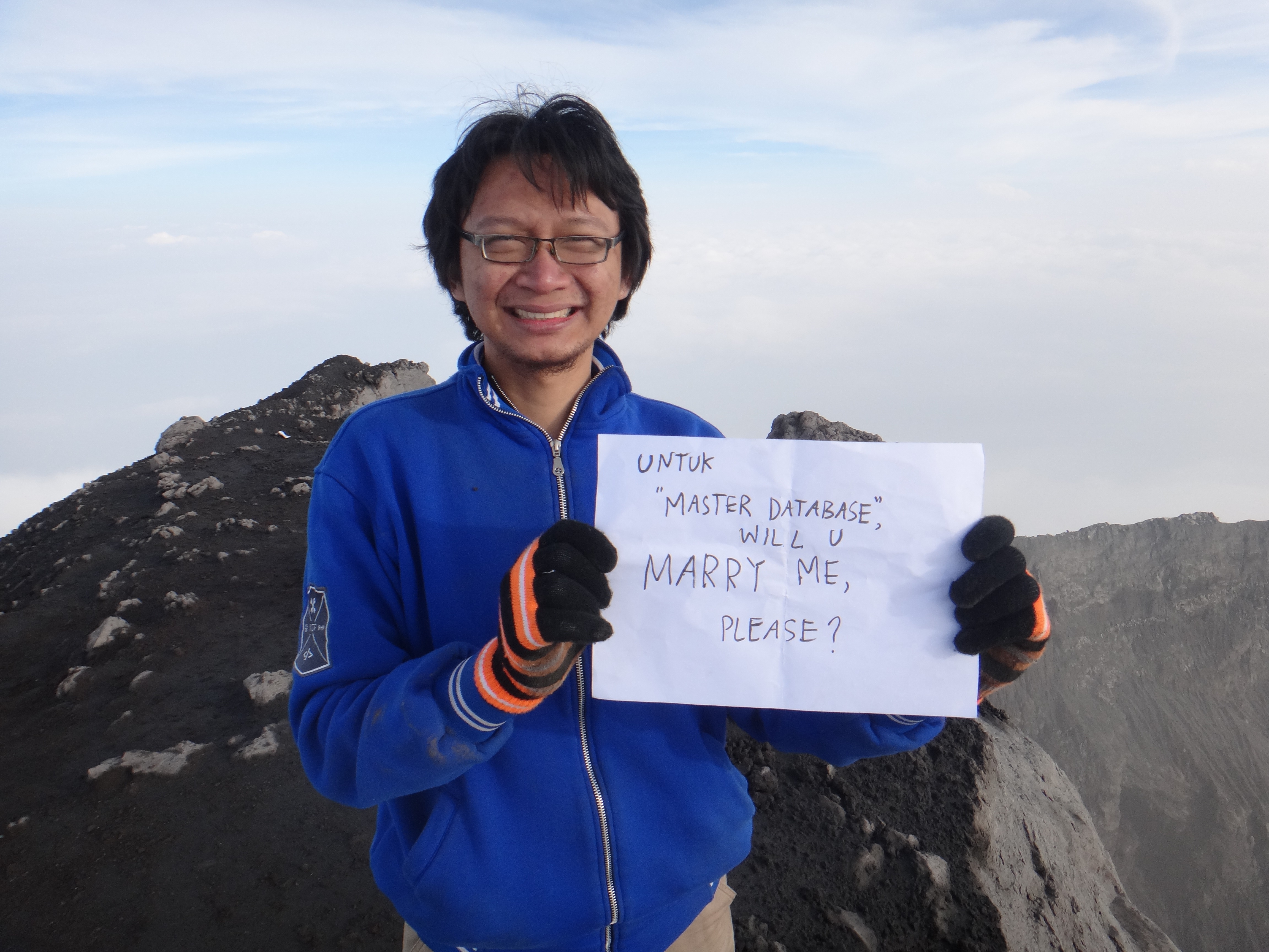 | A6 : | Nah ini bakal panjang nih penjelasannya. Mereka itu kan mulai di comblang-comblangin sama temen-temennya dari sejak tahun 2012, walau Shinta dan Rico ga ambil pusing dan juga masih asik dengan pekerjaan dan kegiatan mereka masing-masing. Bahkan upaya pencomblangan semakin besar, bahkan berasal dari 2 fakultas. Karena ketika 2013, Shinta sudah tidak lagi mengajar di fakultas yang sama dengan Rico, tapi pindah ke fakultas lain. Kacaunya, temen-temen Shinta di fakultas yang baru jadi ikut nyomblang-nyomblangin dia sama Rico. Memang waktu itu masing-masing ga ada kepikiran bakal jadi beneran. Rico waktu itu belom mikirin nikah, alesannya sih mau persiapan dulu dengan sebaik-baiknya, terutama persiapan financial (intinya sih lagi seneng cari duit), dan ada target-target lain yang masih mau dia capai. Shinta juga sama, pertimbangan kesiapan dan belum dibolehin nikah sama mamanya karena belum beres kuliah S2 nya. Disuruh selesaiin dulu kuliahnya, baru nikah. Padahal waktu itu ada beberapa tawaran ta'aruf dari rekanan teman-teman Shinta. Tapi ga bisa dilanjut proses karena memang belum dapet SIM (Surat Ijin Menikah) dari mamanya. Jadi Shinta ga ambil pusing dengan upaya pencomblangan temen-temennya ke si Rico ini, karena juga memang ada beberapa alasan yang bikin Shinta lebih milih temenan aja sama Rico daripada dijadiin suami. Lain hal dengan Rico, dia paling ga suka dan kesel banget klo dijodoh-jodohin gitu. Rico tuh mau usaha sendiri. Ga mau dia dicomblang-comblangin gitu. Makanya dia emosi berat klo dah di-ceng-ceng-in sama temen-temennya. Rico itu baru kepikiran serius mau nikah itu sekitar awal 2014, dan memutuskan untuk memilih Shinta sebagai calon istrinya itu bulan pertengahan 2014. Disitu dia mulai penjajakan secara personal. Rico mulai pendekatan ke orang tuanya (Rico). Begitu sudah lampu hijau dari orang tuanya, barulah Rico menanyakan kesediaan Shinta untuk menikah dengan Rico yang diabadikan dalam foto di bawah:![]() Puncak Gunung Kerinci (3805 mdpl), 5 November 2014 Tapi foto moment tersebut tidak langsung Shinta terima. Shinta baru mendengar langsung dari Rico tanggal 14 November 2014. Akhirnya setelah itu mereka berproses. Dibilang proses ta'aruf sebenernya ga juga. Karena mereka berdua dah saling kenal satu sama lain. Bahkan bukan kenal lagi, tapi sudah akrab. Proses yang mereka jalani lebih ke perkenalan dengan keluarga masing-masing. Hingga akhirnya pada tanggal 14 Februari 2015 Rico beserta keluarga bertandang ke rumah Shinta dan secara resmi melamar Shinta. Jarak dari proses lamaran informal ke lamaran formal agak lama, karena waktu bulan Desember, Shinta sempat sakit dan diopname. Jadi yah.. butuh waktu untuk pemulihan dan persiapan menjelang lamaran. | |